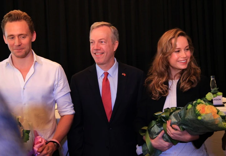 Tom Hiddleston (trái) cùng đại sứ Hoa Kỳ Ted Osius và nữ diễn viên Brie Larson – nữ diễn viên chính của Kong: Skull Island. Cuối buổi giao lưu, Việt Nam dành tặng cho các thành viên đoàn làm phim những bó hoa trong đó có hoa Sen, trong khi đoàn làm phim tặng lại cho đại diện Việt Nam những hộp kẹo chocolate.