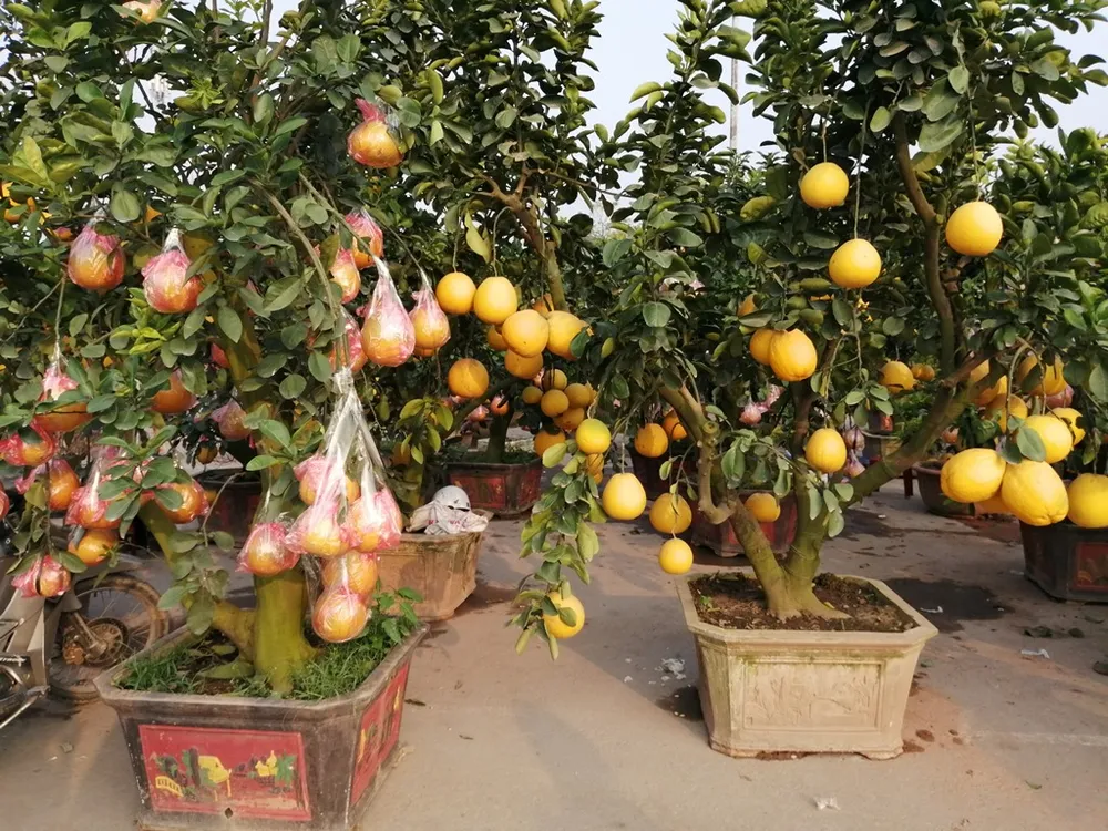 Bưởi ghép cũng là một trong những loại cây cảnh chơi Tết nổi bật. Mỗi gốc bưởi thường được ghép từ 20-30 quả, có giá từ 10-20 triệu đồng. Ảnh: PHÚC BÌNH.