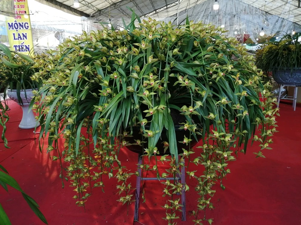 Chậu lan trần mộng rất nhiều vòi hoa này nhận được nhiều sự chú ý của khách. Ảnh: PHÚC BÌNH.