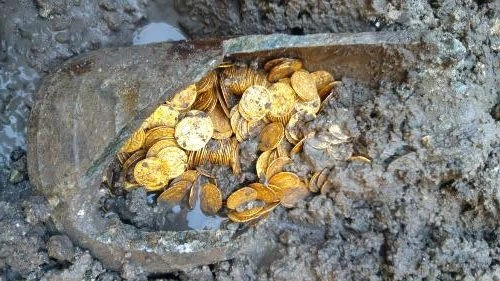 Số đồng tiền vàng này được chứa trong một chiếc hũ, có niên đại từ thời đế chế La Mã. Ảnh: CNN