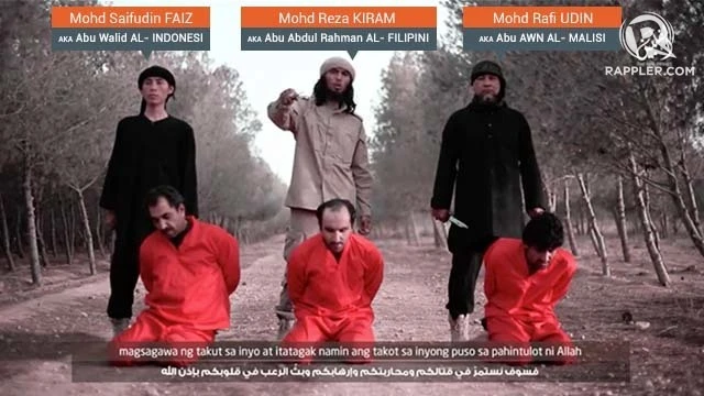 Abu Walid (đầu tiên từ trái sang), một phần tử khủng bố người Philippines và Malaysia xuất hiện trong video hành quyết ba tù nhân. Ảnh: Rappler