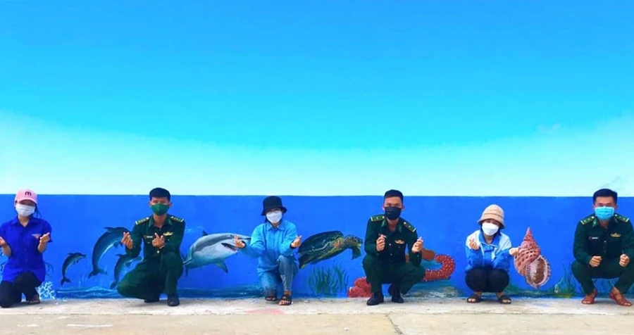 Cụ thể, nhằm tuyên truyền cho người dân không đánh bắt, khai thác các loại sinh vật biển nguy cấp, quý hiếm, Chi đoàn Đồn Biên phòng cửa khẩu cảng Phú Quý, Bộ đội Biên phòng Bình Thuận phối hợp với xã Đoàn thanh niên xã Tam Thanh tổ chức thực hiện công trình vẽ tranh trực quan tuyên truyền tô điểm kè biển.
