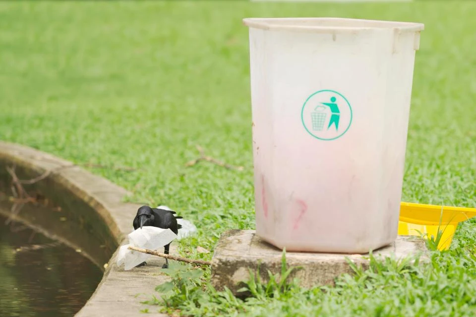 Một chú quạ đang dọn dẹp rác ở công viên. Ảnh: Getty