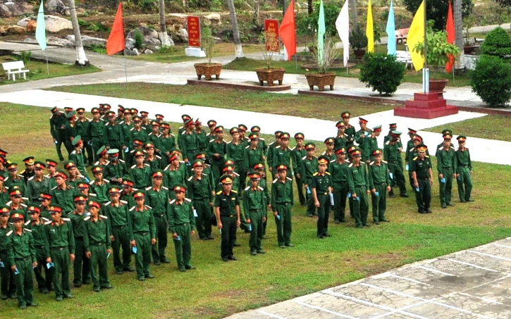 Lực lượng vũ trang Quân khu 9 đóng quân trên đảo Thổ Châu xếp hàng chuẩn bị thực hiện bầu cử. Ảnh: CTV - THANH HẬU