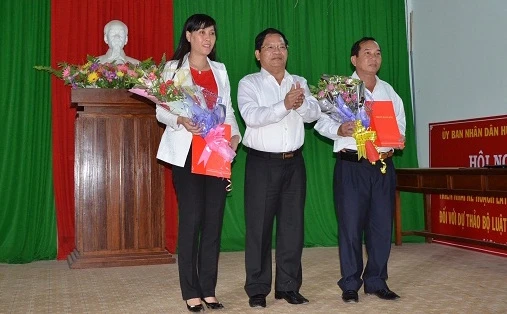 Bà Bùi Thị Quỳnh Vân (bên trái) trong buổi công bố bổ nhiệm Bí thư Huyện ủy Lý Sơn, Quảng Ngãi. Ảnh: Quảng Ngãi