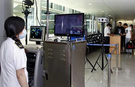 Nhân viên Trung tâm Kiểm dịch quốc tế tại sân bay Tân Sơn Nhất giám sát thân nhiệt của hành khách qua máy đo. Ảnh: TTXVN