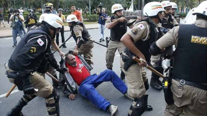 Cảnh sát đã dùng dùi cui, khiên chống bạo động và bắn đạn cao su cùng hơi cay vào đám đông biểu tình tại Sao Paulo và Rio nhiều giờ trước khi đội tuyển Brazil đánh bại đội tuyển Croatia với tỉ số 3-1 trong trận khai mạc tại sân Arena Corinthians.