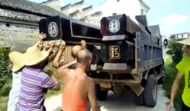 Những chiếc quan tài được chất lên xe đến nơi đập vỡ. Ảnh: YOUKU