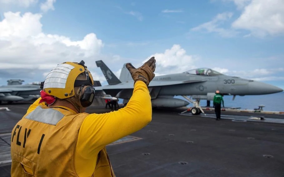 Máy bay F/A-18E Super Hornet chuẩn bị cất cánh từ tàu sân bay USS Carl Vinson ở Biển Đông ngày 6-9-2021. Ảnh: HẢI QUÂN MỸ