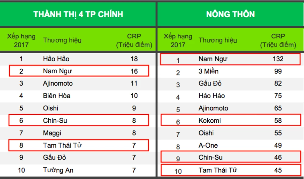 Với sáu nhãn hiệu nằm trong Top 10 các thương hiệu mạnh về thực phẩm và đồ uống, Masan sở hữu số lượng thương hiệu mạnh nhiều nhất trong ngành. Đặc biệt, nhãn hiệu Nam Ngư “tiếp tục là thương hiệu thực phẩm được chọn mua nhiều nhất ở nông thôn đồng thời đứng vị trí thứ hai trong bảng xếp hạng thành thị. Các sản phẩm của Nam Ngư được chọn mua hơn 130 triệu lần bởi gần 80% hộ gia đình ở nông thôn và 16 triệu lần bởi hơn 2/3 hộ gia đình ở thành thị. Cùng với các thương hiệu khác như Chin-su, Tam Thái Tử và Kokomi, “gã khổng lồ” trong nước - Masan Consumer đã củng cố vị thế áp đảo của mình ở bảng xếp hạng ngành thực phẩm” (theo Kantar Worldpanel).