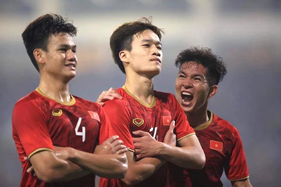 Nguyễn Hoàng Đức (giữa) sau khoảnh khắc anh ghi bàn vào lưới U-23 Thái Lan. ẢNH: CTV