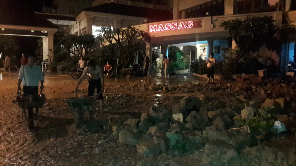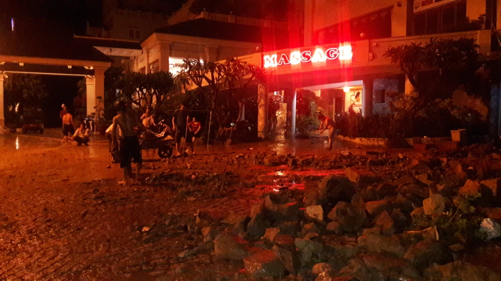 Tại hiện trường ngổn ngang gạch, đá và đất bùn, một số bàn ghế tràn ra ngoài. Bình gas to trong bếp khách sạn Kỳ Hòa đã bị nước mưa cuốn lăn xuống tận đường Trần Phú- sát biển. Nước mưa, bùn cũng tràn vào trong nhà để xe của khách sạn. Trước mặt khách sạn Kỳ Hòa bùn, đất đá dồn lại một lớp dày.