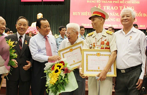 Lãnh đạo TP.HCM trao huy hiệu Đảng cho các đảng viên. Ảnh: TÁ LÂM