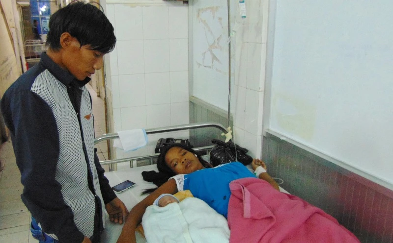 Vợ chồng anh Nhỏ, chị Ánh bên cạnh con trai tại khu hậu sản BV Đa khoa Kiên Giang. Ảnh: PHẠM PHƯƠNG