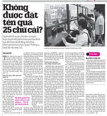 Bộ trưởng Bộ Tư pháp Hà Hùng Cường ngày 12-5 đã báo cáo kết quả góp ý dự thảo Bộ luật Dân sự (sửa đổi), trong đó đáng chú ý là ý kiến đề xuất họ, tên và chữ đệm của công dân Việt Nam không được vượt quá 25 chữ cái. Nhiều ý kiến cho rằng nên quy định như vậy nhưng cũng không ít ý kiến cho rằng cần xem xét lại…