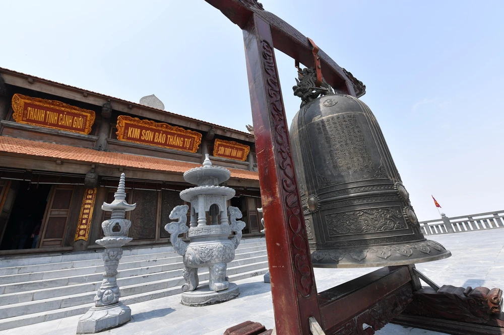 Một trong những công trình kỳ công khác khiến du khách không khỏi choáng ngợp là tòa bảo tháp 11 tầng uy nghi được tạo tác từ đá nguyên khối, có kiến trúc kế thừa từ ngôi tháp chùa Phổ Minh (Nam Định) và bệ đá trang trí hình hoa sen.