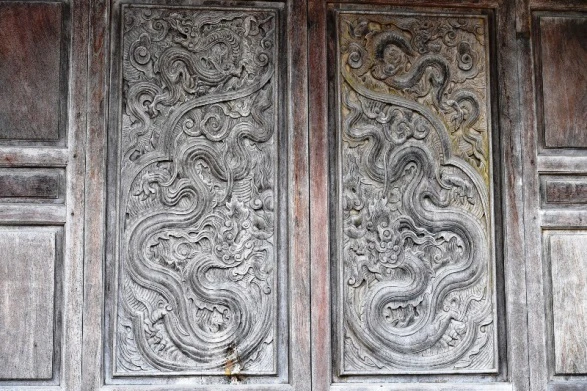 Cách trang trí họa tiết rồng cũng được thể hiện nổi bật ở các thiết kế cửa gỗ nơi đây. Khác với mỹ thuật thời Lý, rồng thời Trần có xu hướng mập khỏe hơn, dữ tợn hơn, biểu tượng cho uy quyền, sức mạnh và sự thịnh vượng của triều đại.