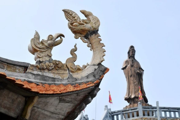 Các kiến trúc sư kiến tạo nên cụm công trình này đã cố gắng tạo ra những nếp chùa nhuần nhị Việt không có nhiều màu sắc, không có sự khuếch trương, bởi thế nên các trang trí góc mái cũng được lấy tiền mẫu từ các di chỉ thành Thăng Long phục chế lại.