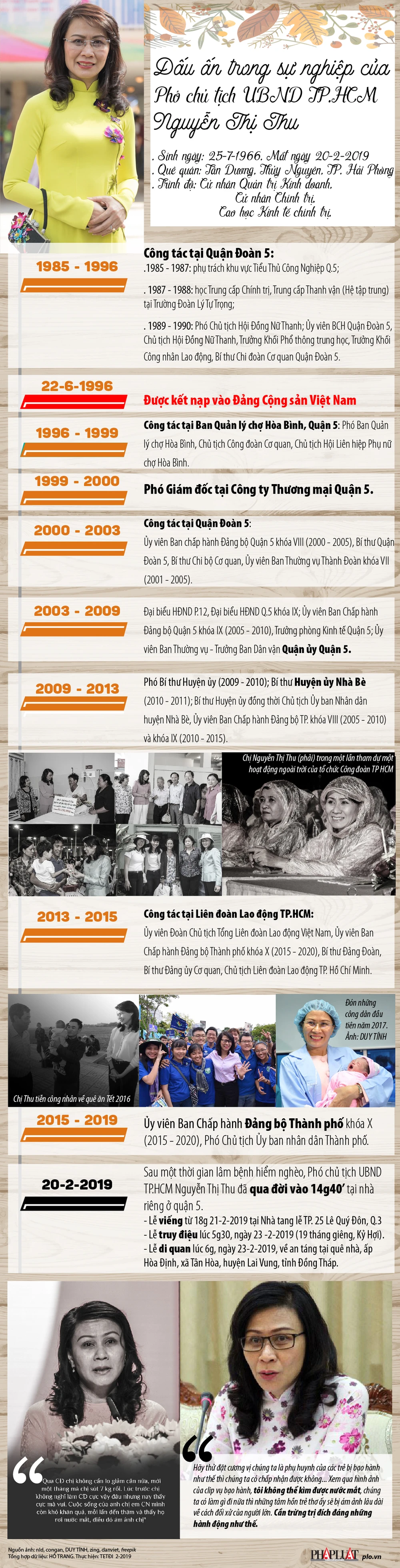 (PLO)- Sau một thời gian lâm bệnh hiểm nghèo, Phó chủ tịch UBND TP.HCM Nguyễn Thị Thu đã qua đời vào 14g40’ 20-2-2019 tại nhà riêng ở quận 5. Lễ viếng từ 18g thứ năm 21-2-2019 tại Nhà tang lễ TP. 25 Lê Quý Đôn, Q.3. Lễ di quan lúc 6g thứ bảy 23-2-2019, về an táng tại quê nhà, ấp Hòa Định, xã Tân Hòa, huyện Lai Vung, tỉnh Đồng Tháp.