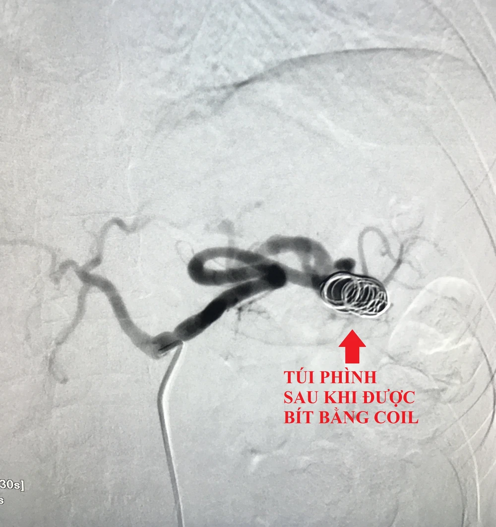 Theo đó, các bác sĩ mở một lỗ nhỏ ở động mạch đùi, qua đó luồn ống thông vô đến lỗ động mạch lách, sau đó đến vị trí túi phình và thả 3 coil (vòng xoắn kim loại) bít hoàn toàn túi phình. Bệnh nhân hết đau tức vùng bụng và được xuất viện sau 2 ngày.