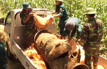 Lực lượng chức năng đưa đầu đạn tên lửa ra xa khu dân cư. Ảnh: KIM BẢO