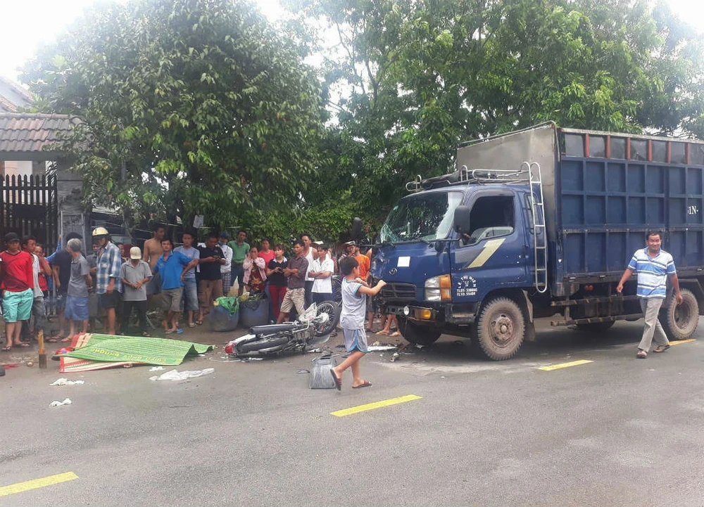 Cú tông mạnh khiến hai thanh niên văng xuống đường, tử vong tại chỗ. Xe máy bị biến dạng trong khi phần đầu xe tải bị hư hỏng nhẹ.