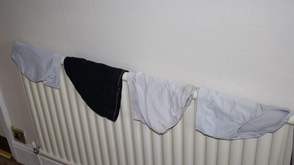 Nghệ sĩ Dominic Allan, nghệ danh là Dominic of Luton, đã chụp hình đồ lót của bố mình đang phơi trên bộ tản nhiệt cho tác phẩm của mình. Ảnh: SWNS