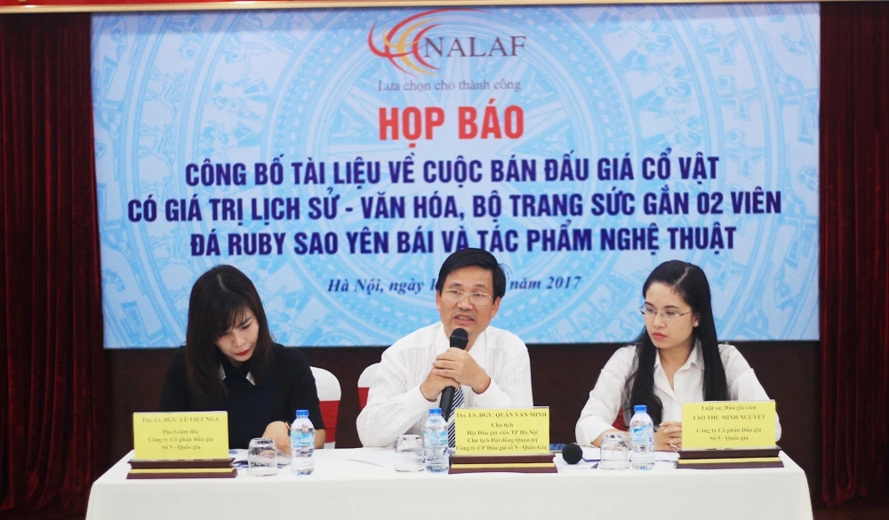 Ngày 10-7, Công ty Cổ phần Đấu giá số 5 Quốc gia đã tổ chức buổi họp báo thông báo về việc bán đấu giá “Một sổ cổ vật, tác phẩm nghệ thuật có giá trị cao về lịch sử-văn hóa và bộ trang sức gắn hai viên đá ruby sao Yên Bái, Việt Nam”. Buổi lễ đấu giá sẽ được tổ chức vào 18 giờ ngày 19-8 tại khách sạn Hà Nội (Giảng Võ, quận Ba Đình, Hà Nội).