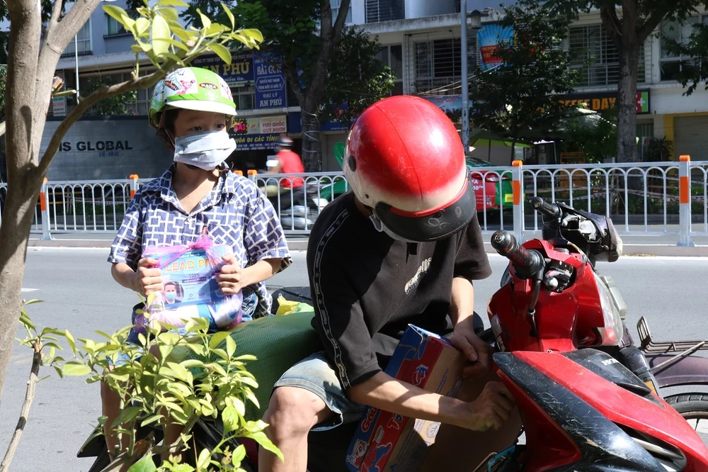 Một gia đình đến nhận quà do công ty nơi làm việc đã đóng cửa nghỉ dịch. Ảnh: ÁNH TRINH