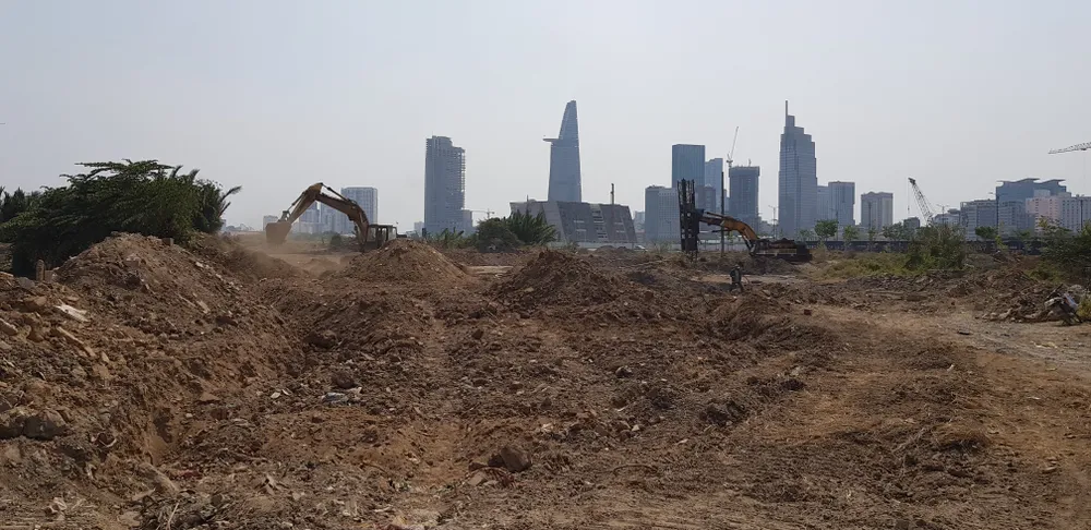 Dự án xây dựng hạ tầng chín lô đất đang được triển khai ở Thủ Thiêm. Ảnh: KIÊN CƯỜNG