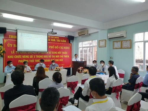 Trong buổi sáng, phiên đấu giá lô đất 3-5 thuộc khu chức năng số 3, Khu đô thị mới Thủ Thiêm có diện tích 6.446m2, giá khởi điểm 578,042 tỉ đồng có 21 khách hàng là các doanh nghiệp tham gia mua đấu giá.