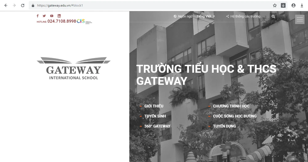 Trên trang chủ của website trường Gateway, phần tên trường bằng tiếng Việt ghi rõ "Trường Tiểu học và THCS Gateway", nhưng tên tiếng Anh lại là "Gateway Internatinonal School". Ảnh chụp màn hình ngày 1-9.