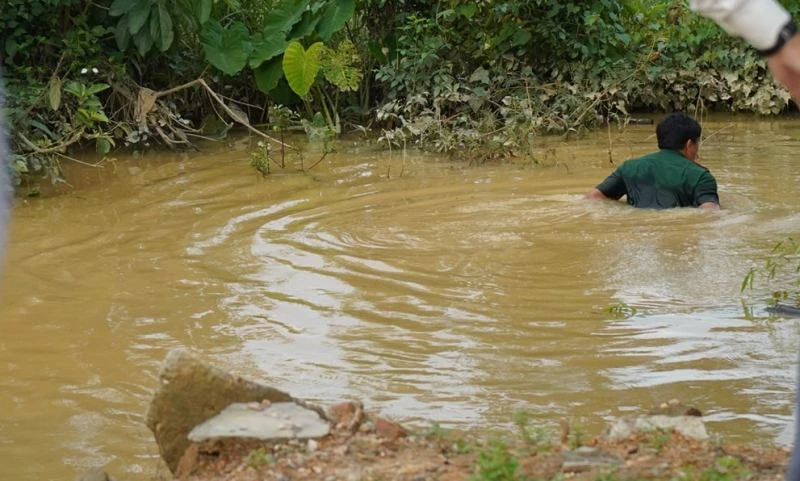 Người dân xuống khe nước mò, tìm thi thể ba trẻ em.