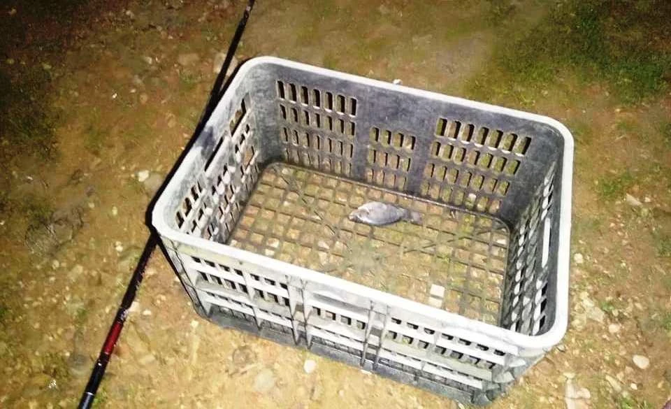 Giỏ nhựa đựng một con cá nhỏ và chiếc cần câu của hai cháu để lại trên bờ. Ảnh: XUÂN TÁM.