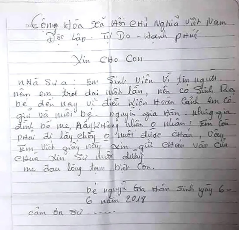 Em còn phải đi lấy chồng, không nuôi được cháu. Vậy em viết giấy này xin gửi cháu vào cửa chùa xin nhà sư nuôi dưỡng.