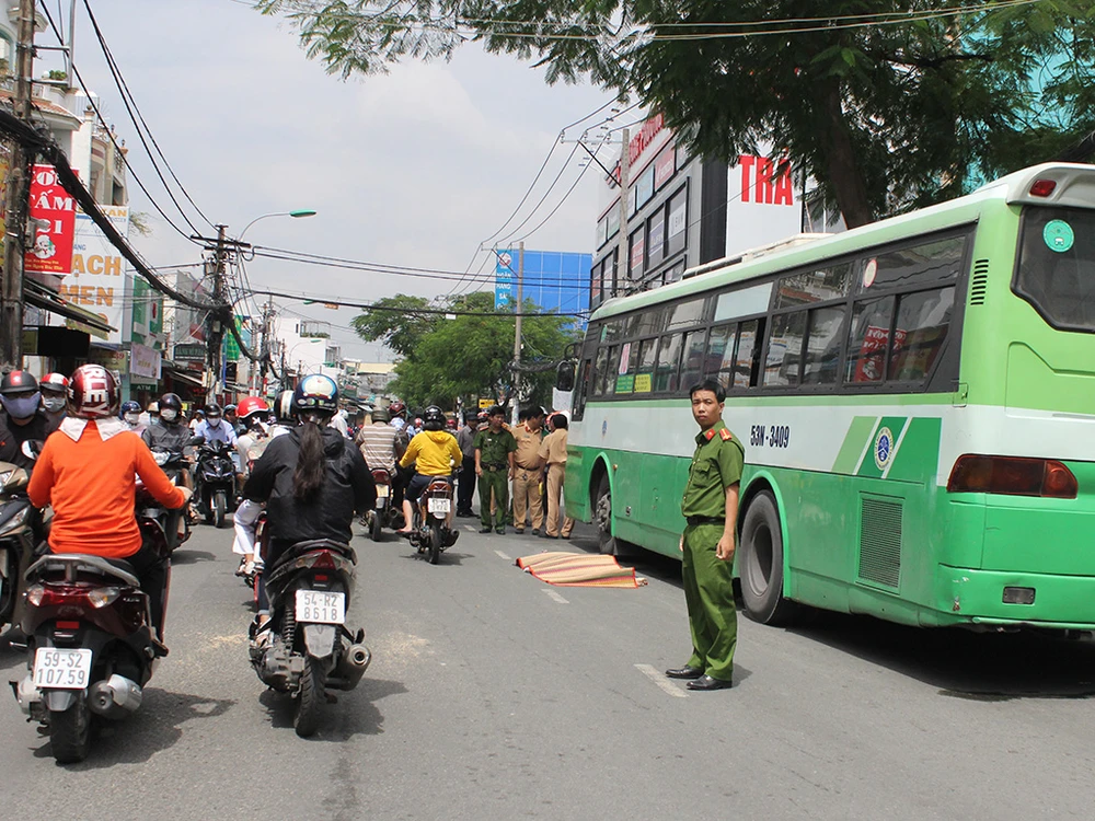 Người phụ nữ đi bộ qua đường thì bị xe buýt cán phải, tử vong. Ảnh: H.Tâm