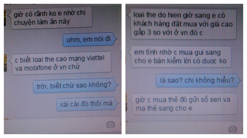 Cũng trong sáng 1-1, chị GH cũng được mời “làm ăn chia lời”. Lần này, FB rủ chị làm ăn lại chính là người em họ của chị đang ở Mỹ. Cũng chiêu chào hỏi, hỏi thăm tin tức, công việc, đối tượng bắt đầu tiếp cận “con mồi” bằng cách rủ mua thẻ cào Viettel và Mobiphone. “Loại thẻ đó hiện giờ sang em (ý là ở Mỹ - NV) có khách hàng đặt mua giá cao gấp 3 so với ở VN. Mua 5 triệu, bán sang Mỹ được 15 triệu”. Đối tượng liên tục hối thúc chị nạp thẻ vì khách hàng cần gấp.