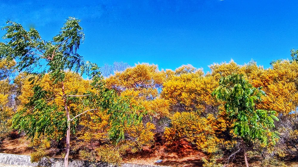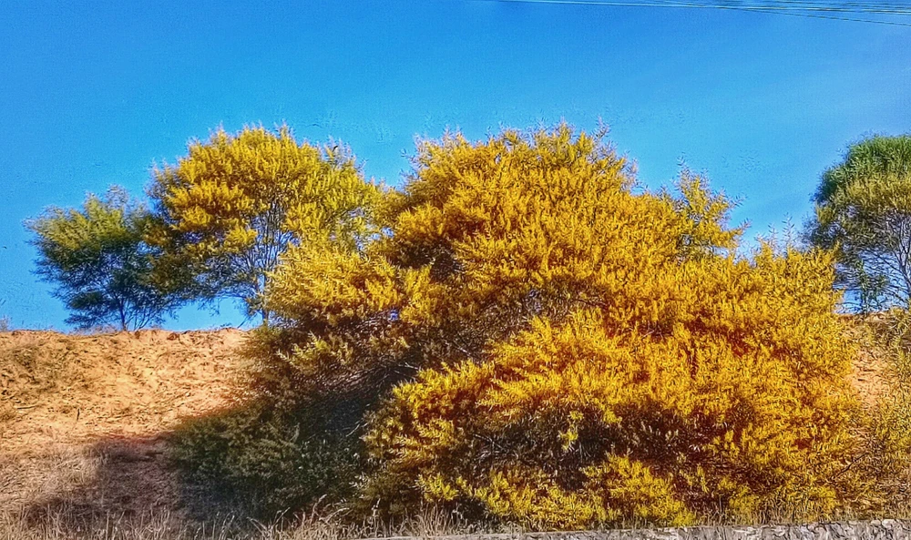Những cánh rừng hoa keo lá tràm rực rỡ sắc vàng ven hai bên đường. Ảnh: NÚI XANH.