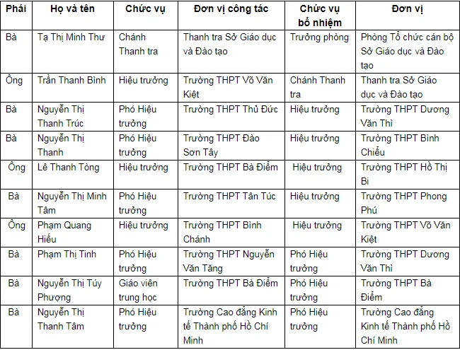 Trong danh sách, Sở GD&ĐT bổ nhiệm năm hiệu trưởng ở các trường THPT: Dương Văn Thì, Bình Chiểu, Hồ Thị Bi, Phong Phú và Võ Văn Kiệt.