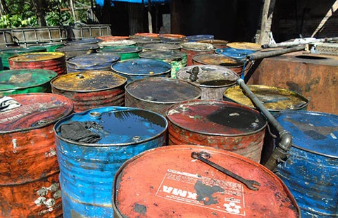 Hàng trăm thùng phuy chứa dầu nhớt cũ nằm khắp nơi trong điểm nấu dầu nhớt ở góc đường N1, lô A3 (KCN Tân Phú Trung). Ảnh: PHƯỚC TĨNH
