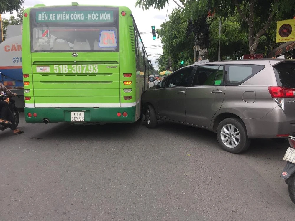 Tại hiện trường, hai phương tiện dính chặt nhau, xe con bị bể móp phần đầu, nhiều hành khách trên xe buýt hoảng loạn, giao thông qua khu vực bị ùn tắc kéo dài.