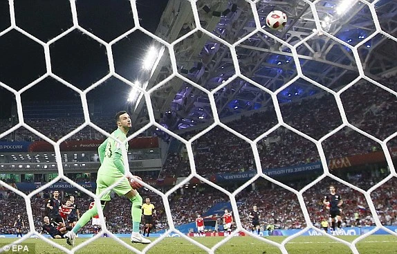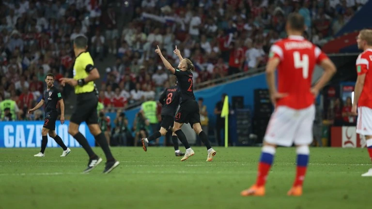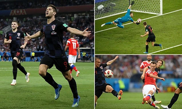 Ngay sau tình huống này, Croatia bất ngờ có bàn thắng thứ hai. Phút 101, từ quả đá phạt góc, Modric treo bóng vào cho hậu vệ Vida bật cao đánh đầu, bóng đi nhẹ và góc qua rừng chân cầu thủ hai đội khiến Akinfeev giật mình bất ngờ không kịp phản ứng để bóng đi luôn vào lưới. 2-1 cho Croatia.