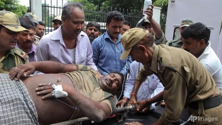 Một lính Biên phòng Ấn Độ bị thương trong vụ đọ súng và đang được chuyển đến bệnh viện thành phố Jammu, Ấn Độ (ảnh: AP)