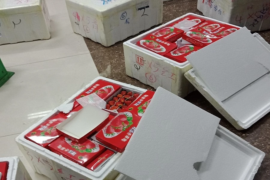 Bên ngoài những thùng xốp và hộp giấy chứa quả dâu tây đều có chữ Trung Quốc, không có tem, nhãn mác tiếng Việt và hạn sử dụng theo quy định.