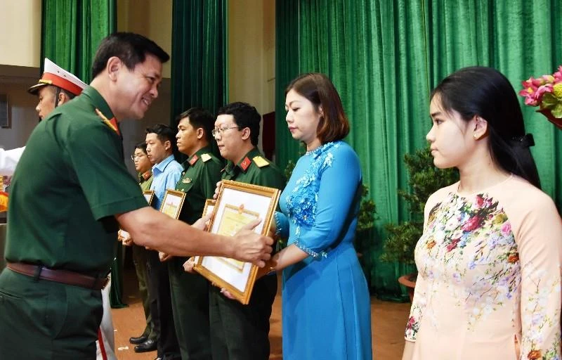 Đại tá Nguyễn Trường Thắng, Tư lệnh Bộ Tư lệnh TP.HCM , tặng bằng khen cho các tập thể có thành tích xuất sắc trong công tác Giáo dục quốc phòng và an ninh năm 2018. Ảnh: TÁ LÂM