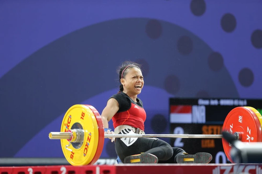 Đoàn thể thao Việt Nam tiếp tục có tấm HCV thứ ba ở bộ môn cử tạ nữ hạng cân 45 kg. Ở lượt thi đấu này, VĐV Vương Thị Huyền gặp nhiều khó khăn khi phải so kè nghẹt thở với nữ HCĐ thế giới Setjawati Lisa.