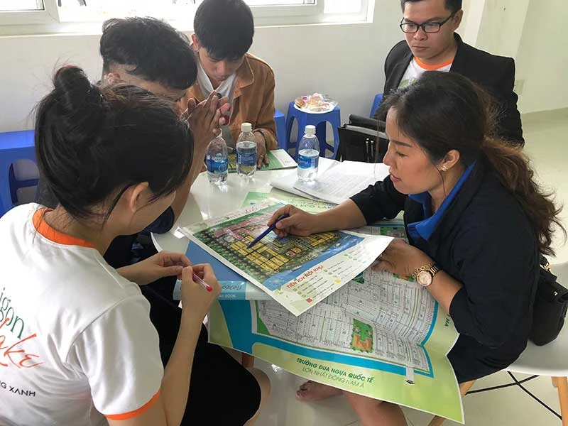 Một nhóm nhà đầu tư đang cùng bàn bạc mua nhà dự án. Ảnh: QUANG HUY