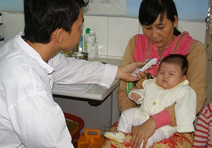 Bác sĩ của Trạm Y tế phường Trung Mỹ Tây (quận 12, TP.HCM) đang khám bệnh cho một bé. Ảnh: TRẦN NGỌC