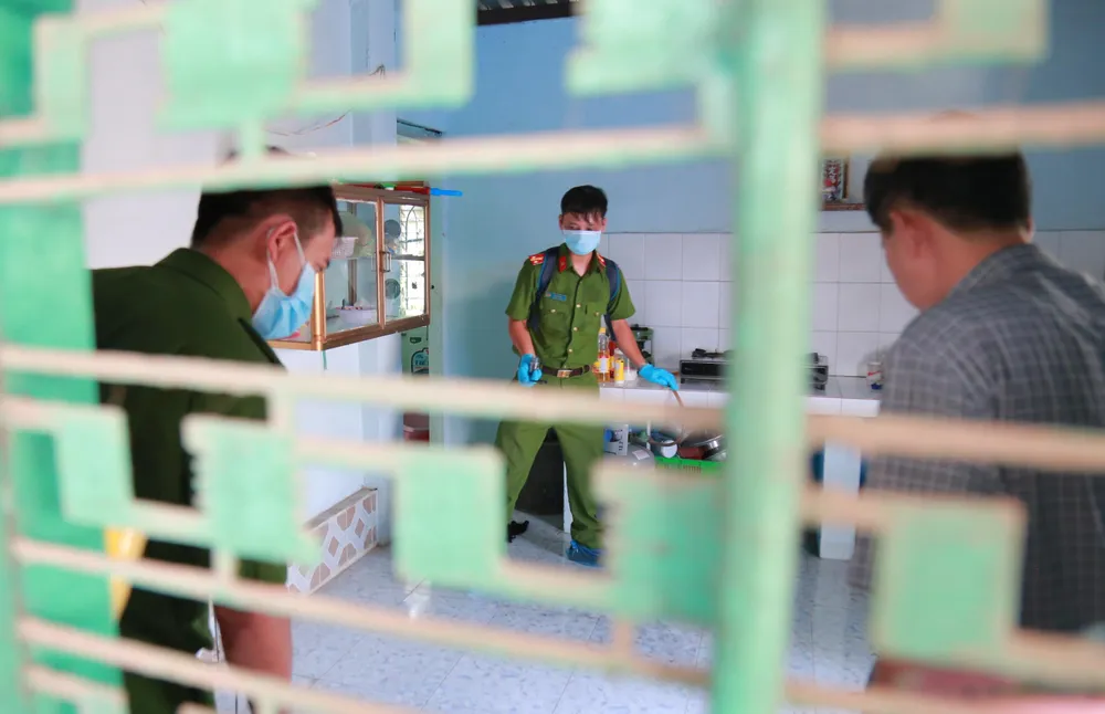 Cơ quan công an khám nghiệm hiện trường phía trong ngôi nhà bị thảm sát.