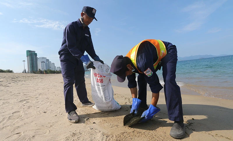 Trong hai ngày qua, Công ty CP Môi trường đô thị Nha Trang huy động nhiều công nhân gom dọn hàng trăm bao với hàng tấn dầu vón cục nằm lẫn trong cát trên bờ biển.